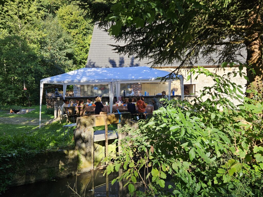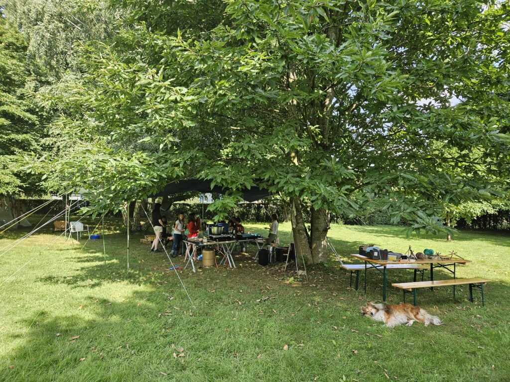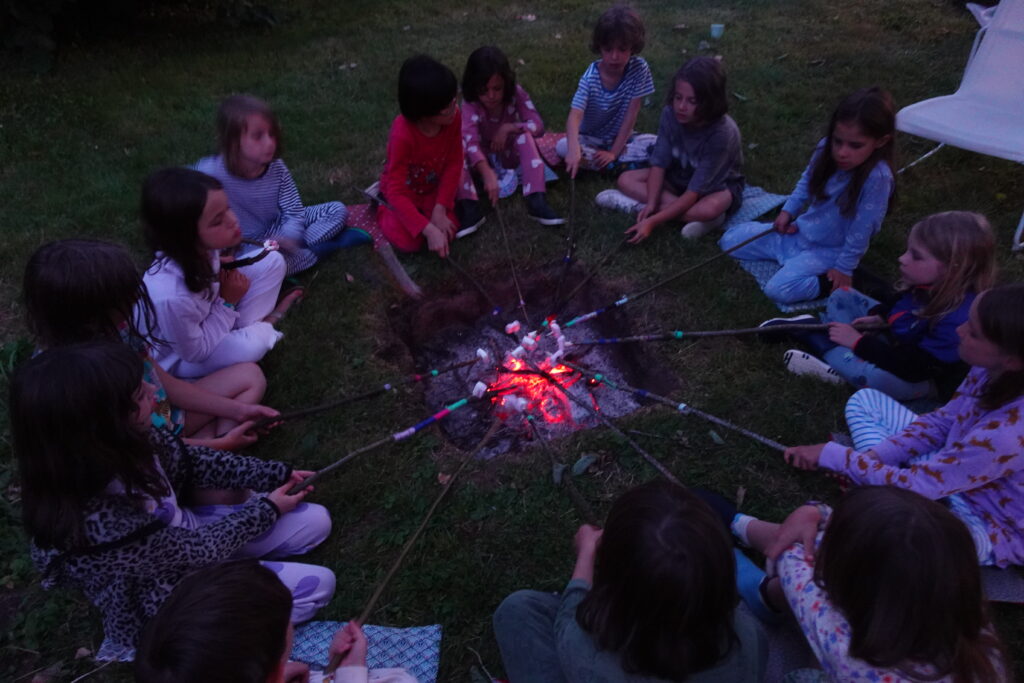 Dormir sous tente dans un grand jardin, cuisiner et manger dehors, faire du feu, s’occuper des poules, cueillir des fruits, chanter, jouer, bricoler …